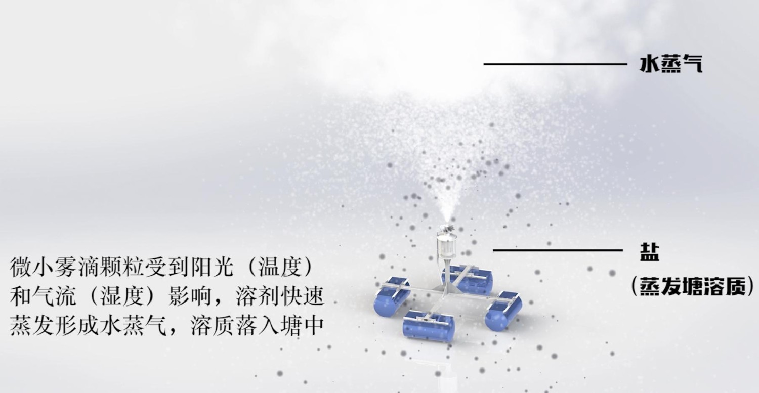 電動機通過支撐柱安裝在浮臺上,電動機的動力輸出軸上設(shè)置有扇片,增壓水泵固定在浮臺下方,電動機外壁上固定有噴水裝置,增 壓水泵通過水管與噴水裝置相連通,噴水裝置的出水口位于扇片的下方。高速運轉(zhuǎn)的葉片將液體打碎形成100~400um的霧滴,微小霧滴顆粒受到陽光(溫度)和氣流 (濕度)影響,溶劑快速蒸發(fā)形成水蒸氣,溶質(zhì)落入塘中。