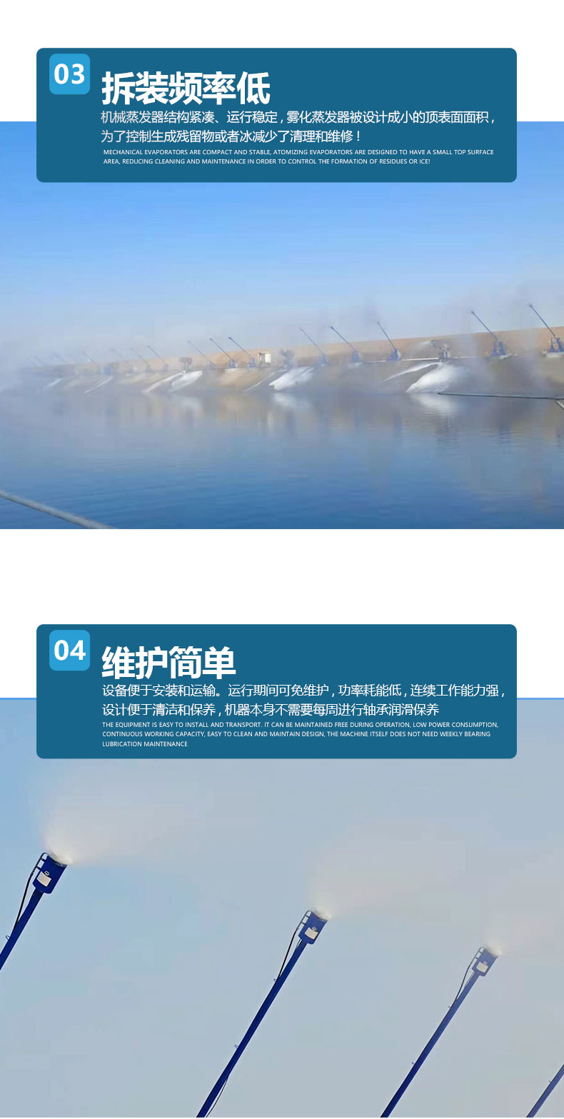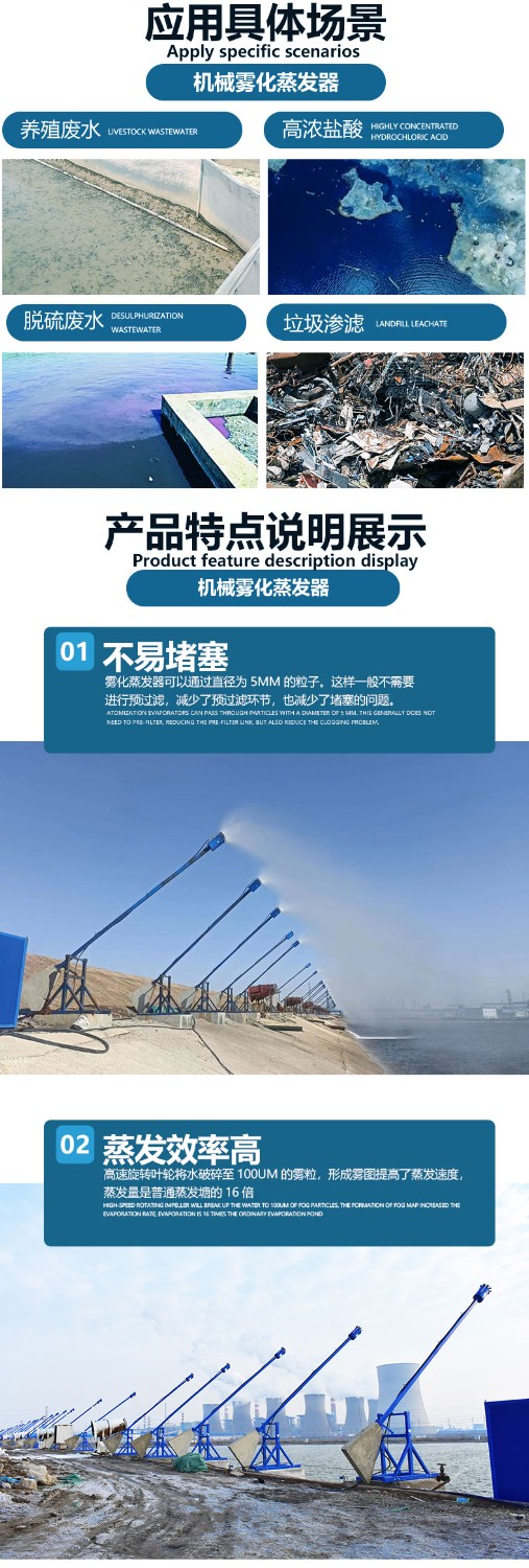 機(jī)械蒸發(fā)可以大大增加蒸發(fā)的速度,相同的水塘面積機(jī)械蒸發(fā)的 速度是普通蒸發(fā)塘的 16 倍以上。機(jī)械蒸發(fā)器結(jié)構(gòu)緊湊、運(yùn)行穩(wěn) 定,而且可以便于安裝和運(yùn)輸。機(jī)械蒸發(fā)是現(xiàn)有蒸發(fā)塘條件下一種低 成本的蒸發(fā)方式。